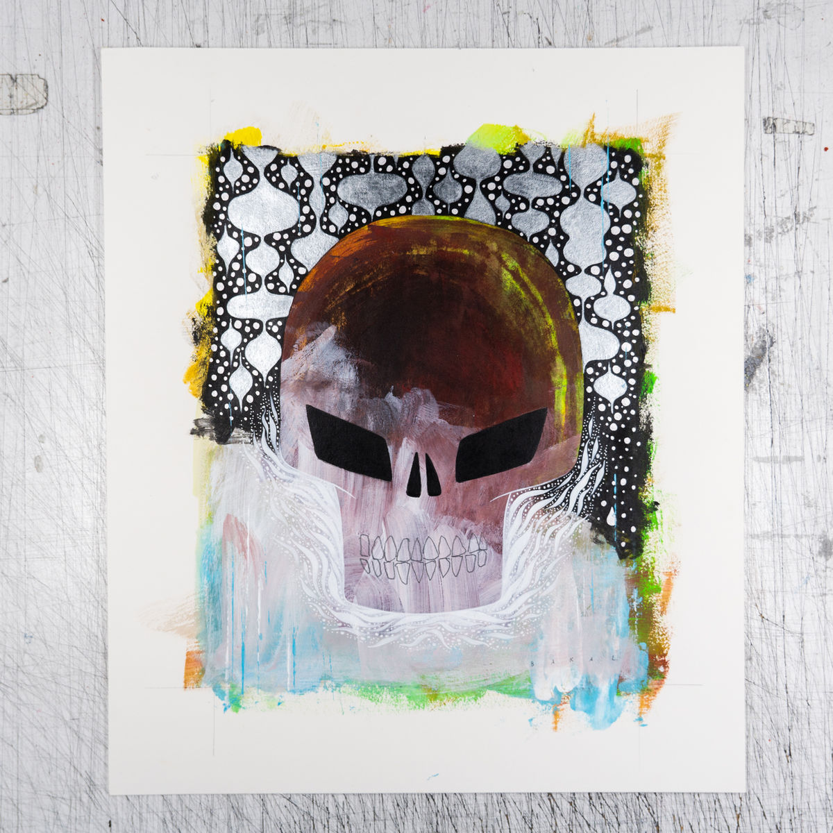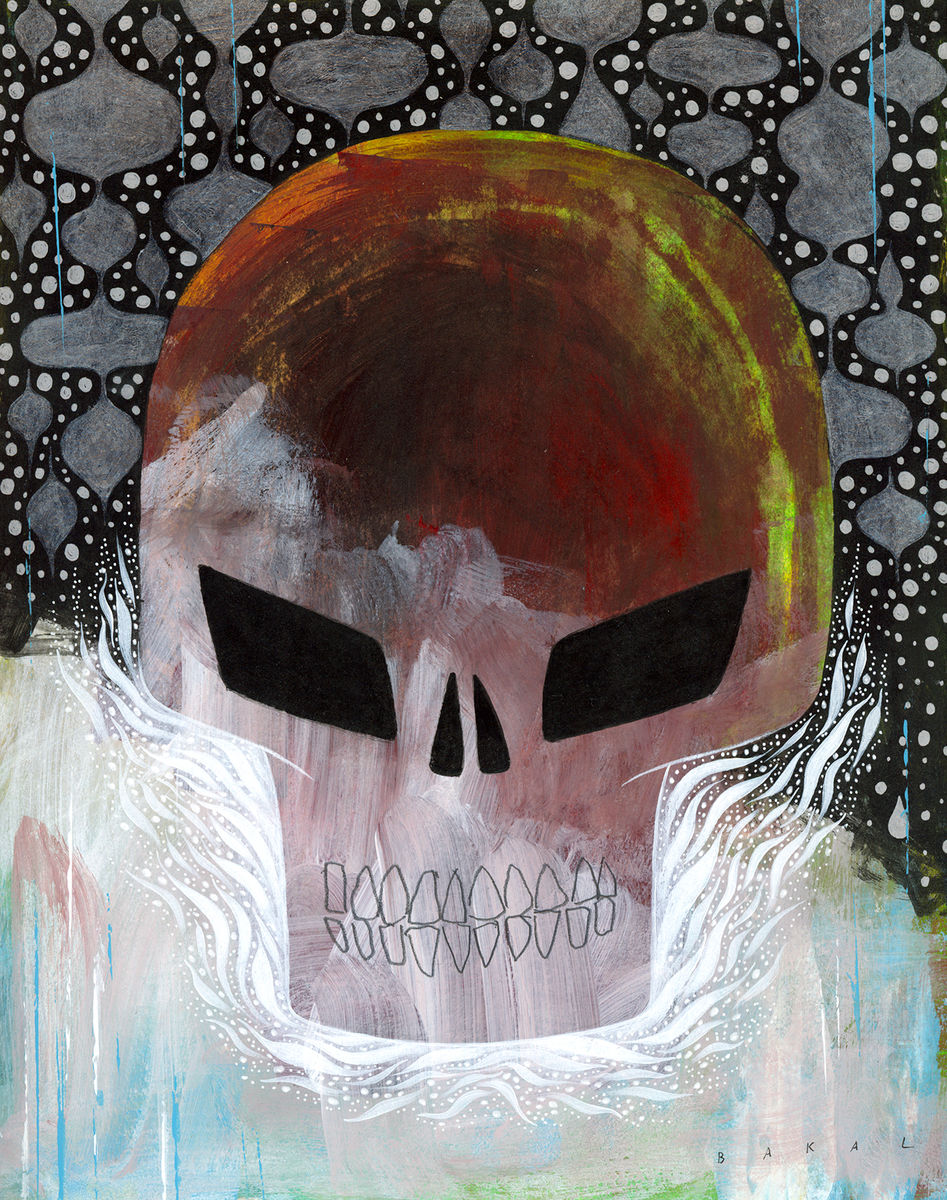 Skulls of Ultimate Death was originally created in a sketchbook which then extended to a series of paintings. Eventually, enough paintings were created and I decided to make a zine. The zine has since fully sold out. The sketchbook drawings were a way to document the passing of family and friends which happened within a short period of time.